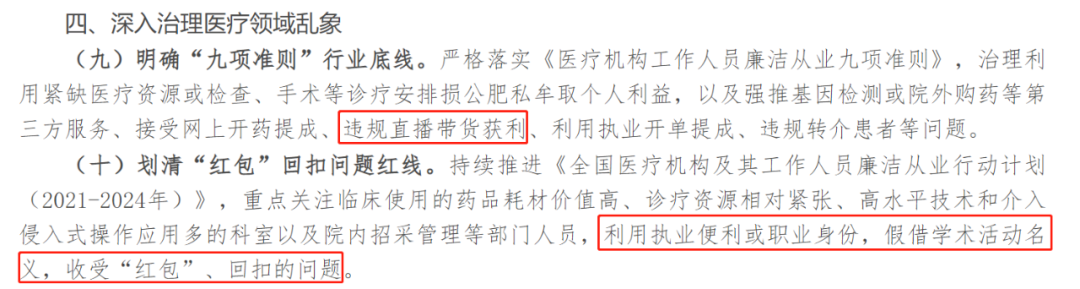 《工作要点》第(九)点“明确‘九项准则’行业底线”,严禁医疗机构工作人员“违规直播带货获利”;第(十)点“划清‘红包’回扣问题红线”,重点关注医疗机构及其工作人员“利用执业便利或职业身份,假借学术活动名义,收受‘红包’、回扣的问题。”